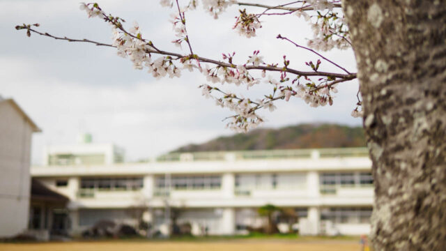 小田小交流プラザの春のひととき。オーディオ設置や児童館の親子の参加、芝はり後の校庭や桜の様子から日常の重なりが見えてきます。