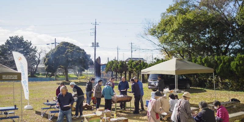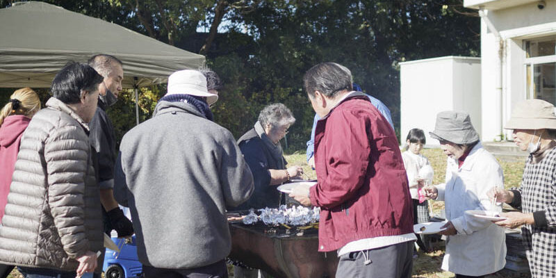 ちょうど入荷したばかりの小田協議会ののぼりを組み立てて、青空のもとお昼のバーベキューを楽しみました。