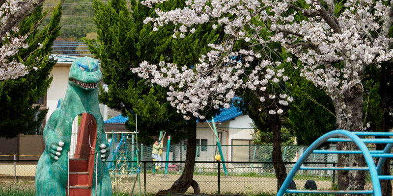 小田城跡の向かいにある保育所では、怪獣の遊具とともに。