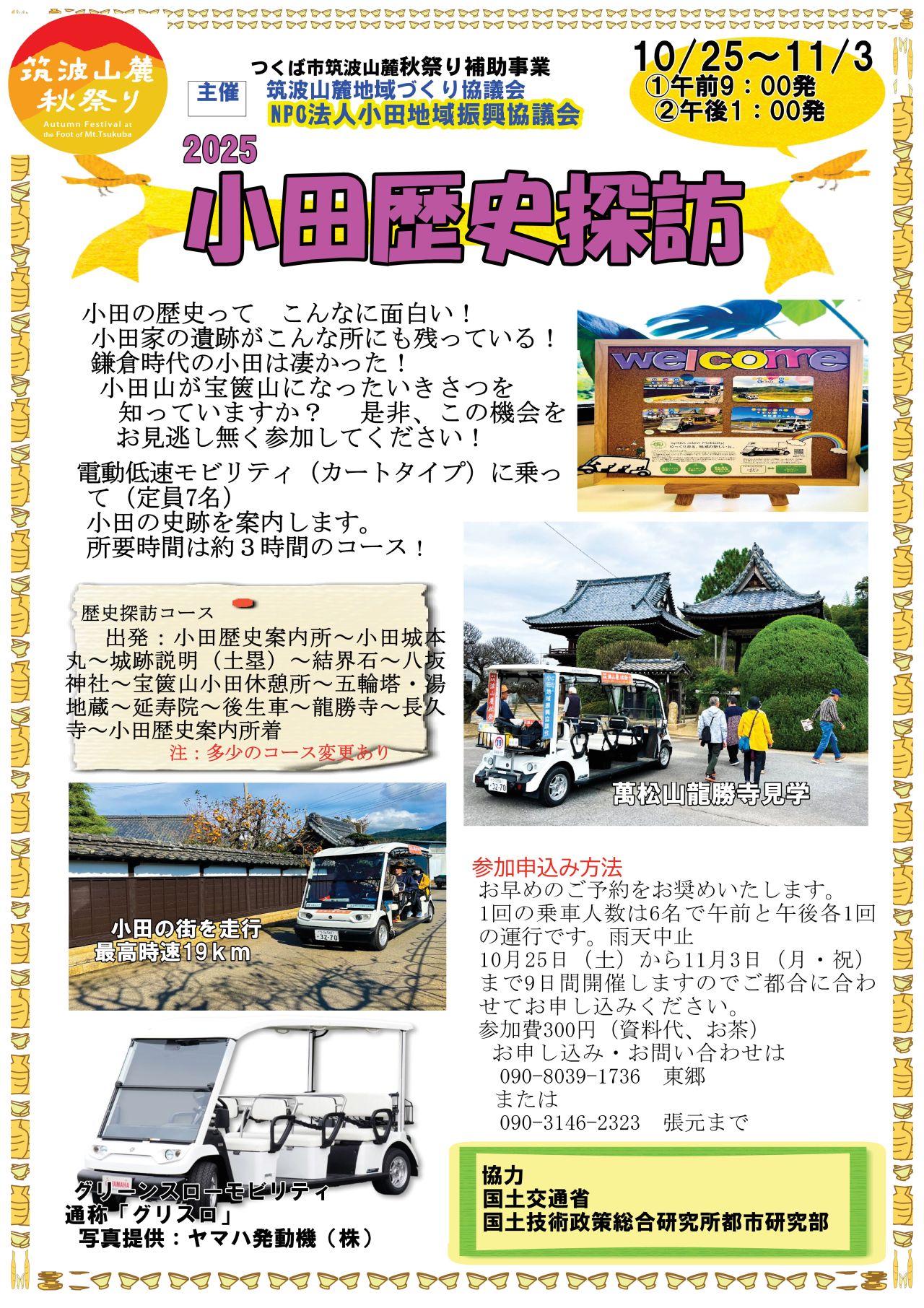 秋の宝篋山ウォーキング大会 参加者募集 – 筑波山麓秋祭り 会員情報秋の宝篋山ウォーキング大会 2025.09.30 小田協議会会員で、宝篋山で歴史遺産の保存や登山道・公園等の整備を行っているNPO法人小田地域振興協議会さんから、イベントのご案内です。 2024年10月25日(土) 8:00~10:00、宝篋山小田休憩所にて受け付けをします。筑波山麓秋祭りの記念スタンプも押せますよ。 主催者から一言 今年の抽選会の景品は、小田の新米1.5kg!トン汁の無料サービスもあります。みなさま奮ってご参加ください。 電話で問合せ(東郷宛)