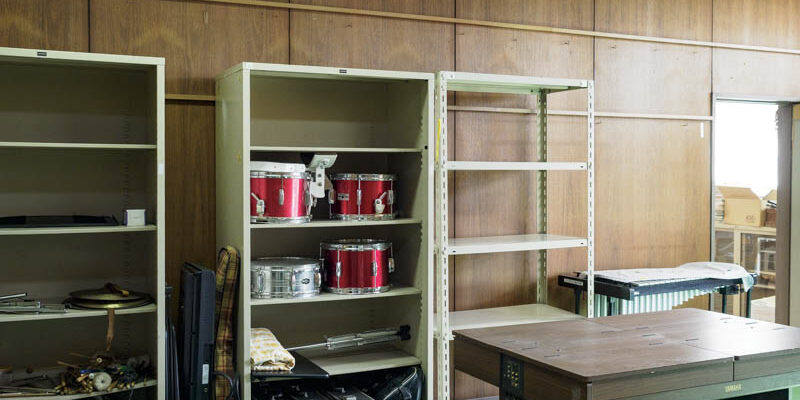 当時のままの1クラスが合奏できる広い舞台と、様々な楽器を収めた棚が並んでいます。