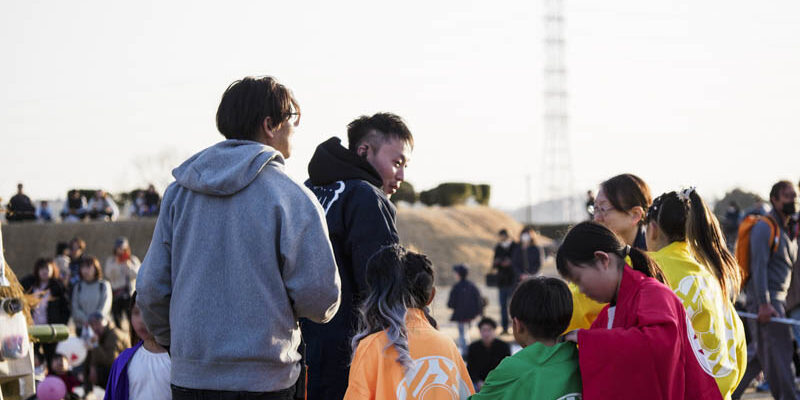 そして数人一組でやぐらを囲み、着火用の布を巻いた竹を抱え、スタッフと待機します。